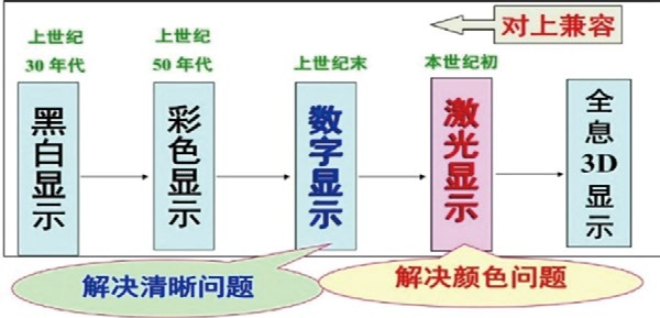 显示是将信息显示给人眼观看的人机界面终端,,集观赏 / 娱乐应用和信息应用于一身,,,,其发展方向是超高分辨(几何 / 颜色双高清)、、、全色化(大色域,,最大色彩范围还原)和真三维(高观看舒适度)。。20 世纪 30 年代出现的黑白显示解决了视频图像的有无问题,,,,20 世纪 50 年代的彩色显示解决了视频图像无颜色问题,,,,20 世纪末出现的数字显示解决了视频图像易受干扰、、、清晰度差的问题。。。当前的激光显示是要解决视频图像的全色问题,,,,将来基于全息术的三维显示技术有望解决真三维(3D)显示问题。。。。可以说,,,显示技术的发展历程(如图1)就是图像保真度不断提高,,,从而走向人眼视觉极限的过程。。。