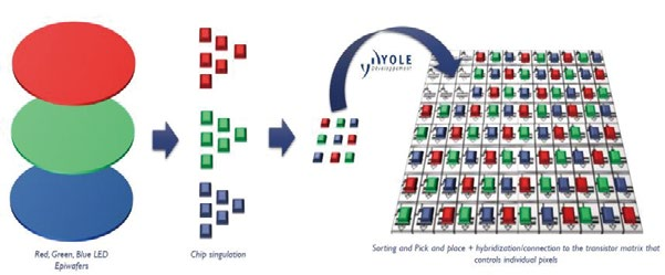 Mini/Micro-LED 显示是由微米级半导体发光像元阵列组成的新型显示技术,,将 LED 器件微小化(<100 %u3BCm)、、薄膜化、、阵列化后,,,,批量转移至电路基板上形成的显示器件,,,具有高亮度、、、、超高分辨率与色彩饱和、、、、发光效率高的特点,,,,不易受水汽、、、、氧气或高温的影响,,稳定性、、、、使用寿命、、、工作温度较好。。。图5为 Micro-LED 工艺流程。。