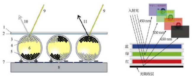 图 6 电子纸显示原理图:黑白(左);彩色(右)(来源:中关村在线)1. 屏幕正面 2. 透明电极层 3. 透明微胶囊;4. 带正电荷的白色粒子;5. 带负电荷的黑色粒子;6. 透明液体;7. 点击像素层;8. 基板;9. 入射光;10. 白色出射光;11. 黑色出射光